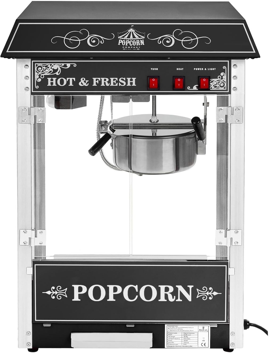- Integrierte Wärmelampe & Bodenheizung für frisches, warmes Popcorn
