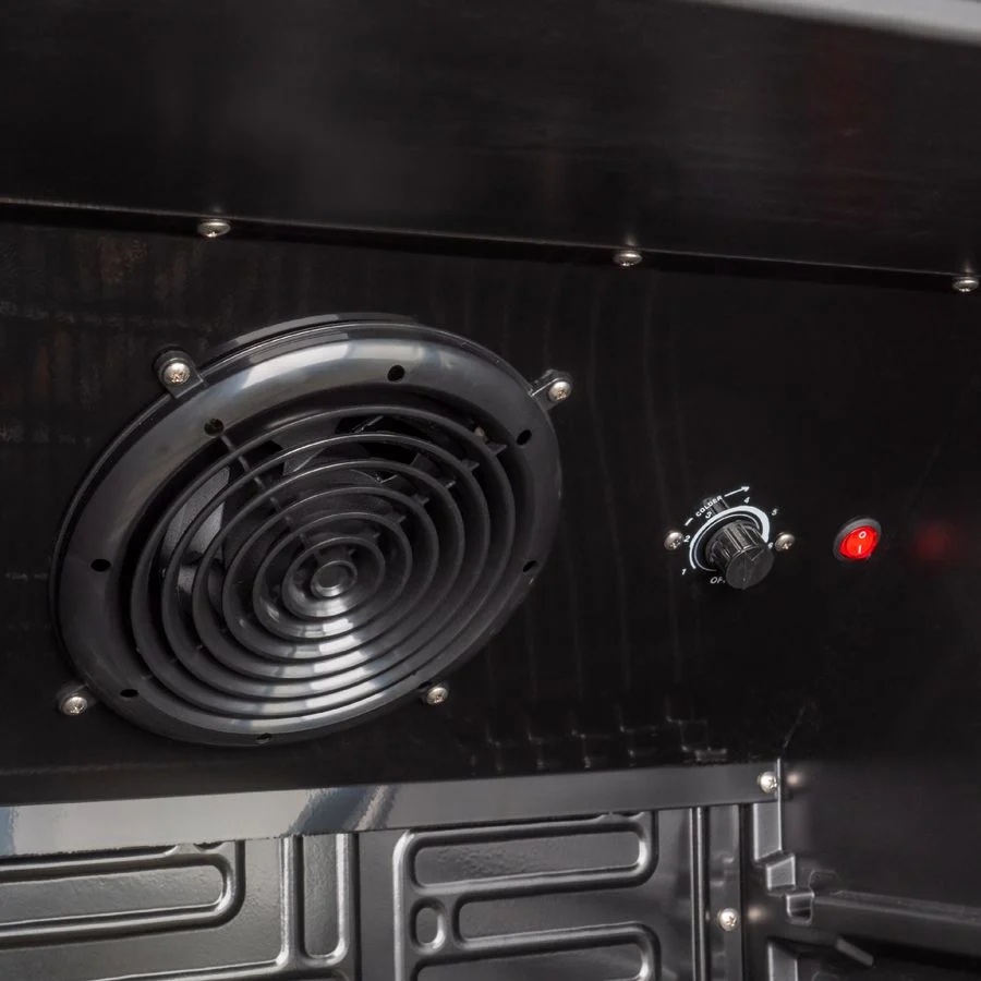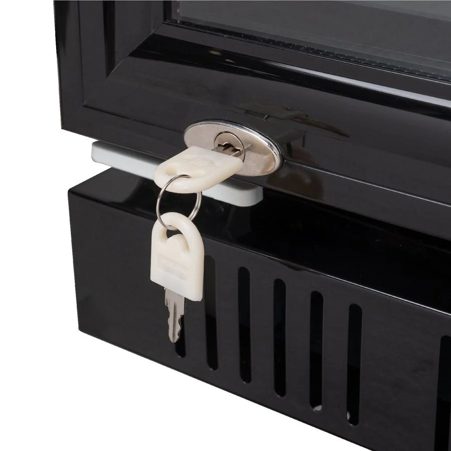 - Mit selbstschließender doppelverglaster Isolierglastür im schwarzen Rahmen