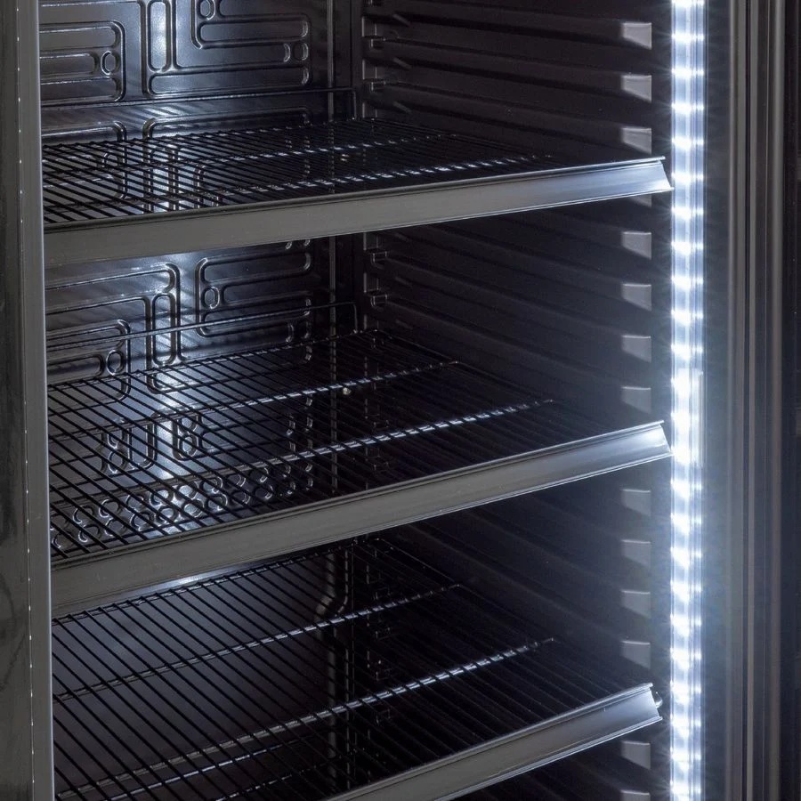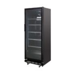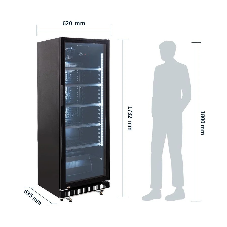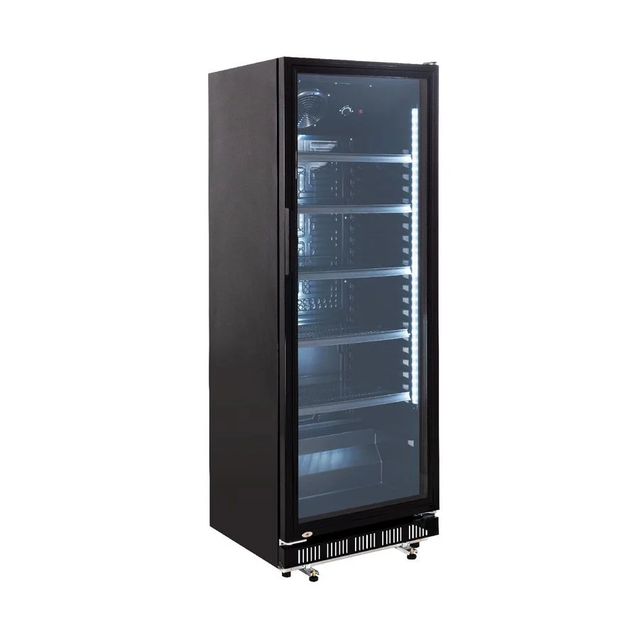 Jetzt den abschließbaren Getränkekühlschrank mit 360 Liter Kühlraumvolumen für Ihre Veranstaltung mieten. Der schwarze Getränkekühlschrank mit Umluftkühlung und Schloss ist ein zuverlässiger Partner für Ihre Verkaufs-Kühlung. Der Gewerbe Kühlschrank mit Glastür begeistert durch eine hochwertige Verarbeitung und garantiert deshalb beste Kühlung auch bei hoher Beanspruchung bei gleichmäßiger und schneller Kälteverteilung. Die horizontale Beleuchtung unterstützt eine Präsentation der Produkte auf den 5 mitgelieferten Rosten. Vielseitige Einsatzmöglichkeiten, egal ob in Bars, Restaurants, Cafés, auf Veranstaltungen, im Vereinsheim oder im eigenen Partykeller.