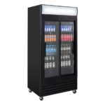 Jetzt den abschließbaren Getränkekühlschrank mit 630 Liter Kühlraumvolumen für Ihre Veranstaltung mieten. Der schwarze Getränkekühlschrank mit Umluftkühlung und Schloss ist ein zuverlässiger Partner für Ihre Verkaufs-Kühlung. Der Gewerbe Kühlschrank mit Glastür begeistert durch eine hochwertige Verarbeitung und garantiert deshalb beste Kühlung auch bei hoher Beanspruchung bei gleichmäßiger und schneller Kälteverteilung. Die horizontale Beleuchtung unterstützt eine Präsentation der Produkte auf den 8 mitgelieferten Einlegeböden. Vielseitige Einsatzmöglichkeiten, egal ob in Bars, Restaurants, Cafés, auf Veranstaltungen, im Vereinsheim oder im eigenen Partykeller.